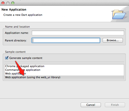 - こちらもおもむろにDart Editorを起動してnew applicationを選択